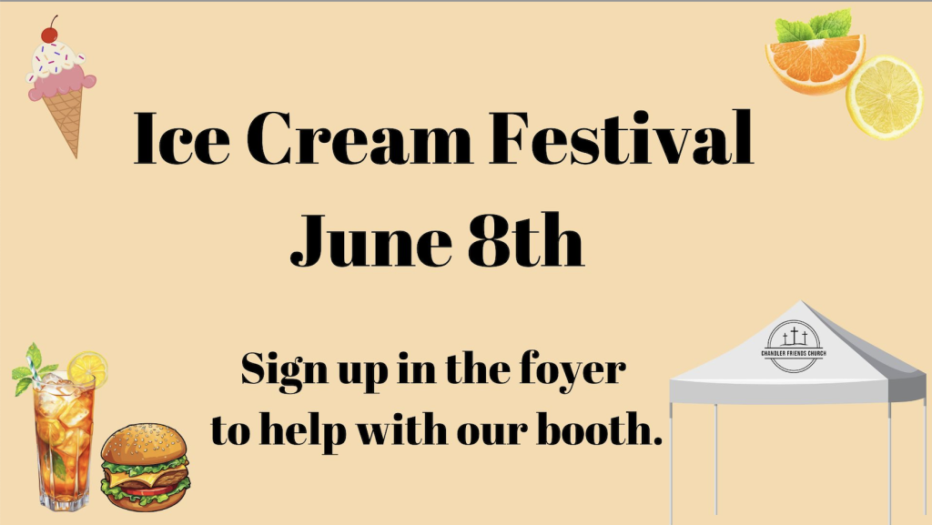 The Ice Cream Festival is this Saturday, June 8th. Chandler Friends Church will serve hamburgers, corn, chips, and drinks to raise funds for the church. If you signed up to help, plan to drop off your supplies and help prepare things at the church on Friday at 6:00pm. We’ll set up the next morning at 9:00am at Tilghman Park. Even if you didn’t sign up to help with the fundraiser, make sure to come by and see us on Saturday! Contact the church office with any questions (405-258-0722).