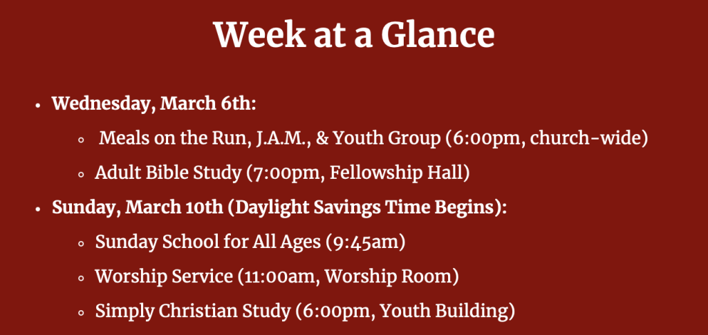 The most important Christian holiday of the year—Easter—is almost upon us! This week’s update has information about Holy Week. Let me know if you have any questions. Also, don’t forget we “spring forward” into Daylight Savings Time this Sunday morning! I’ll see you then.