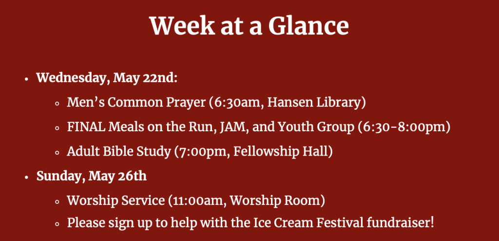 Consider signing up to help at the Ice Cream Festival on June 8th! We set up a booth at the Ice Cream Festival each year to raise funds for the church. In recent years, that money has gone to support the efforts of the Outreach Committee. We serve hamburgers, corn, chips, and drinks. And we have a great time doing it! You can sign up to bring specific items in the north foyer of the church. Contact the church office with any questions (405-258-0722).