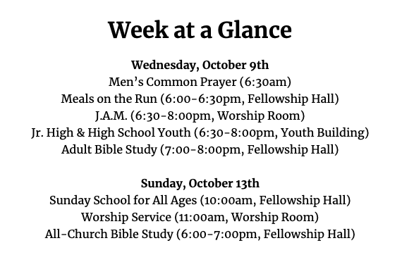 I can’t tell you how much I’ve enjoyed our Bible Study on Sunday nights. Our method is simple. We pray. We read. We talk about what we just read. We make sure not to skip any verses and we ask lots of questions. What I’ve discovered is there’s something about reading the Bible together that brings the Scripture to life. If you have ever found yourself wanting to read the Bible but don’t know where to start—or you struggle to read consistently—I hope you’ll consider joining us on Sunday nights from 6-7pm in the Fellowship Hall. Come when you can, and you don’t need to do any prep beforehand. Childcare is available just down the hallway.